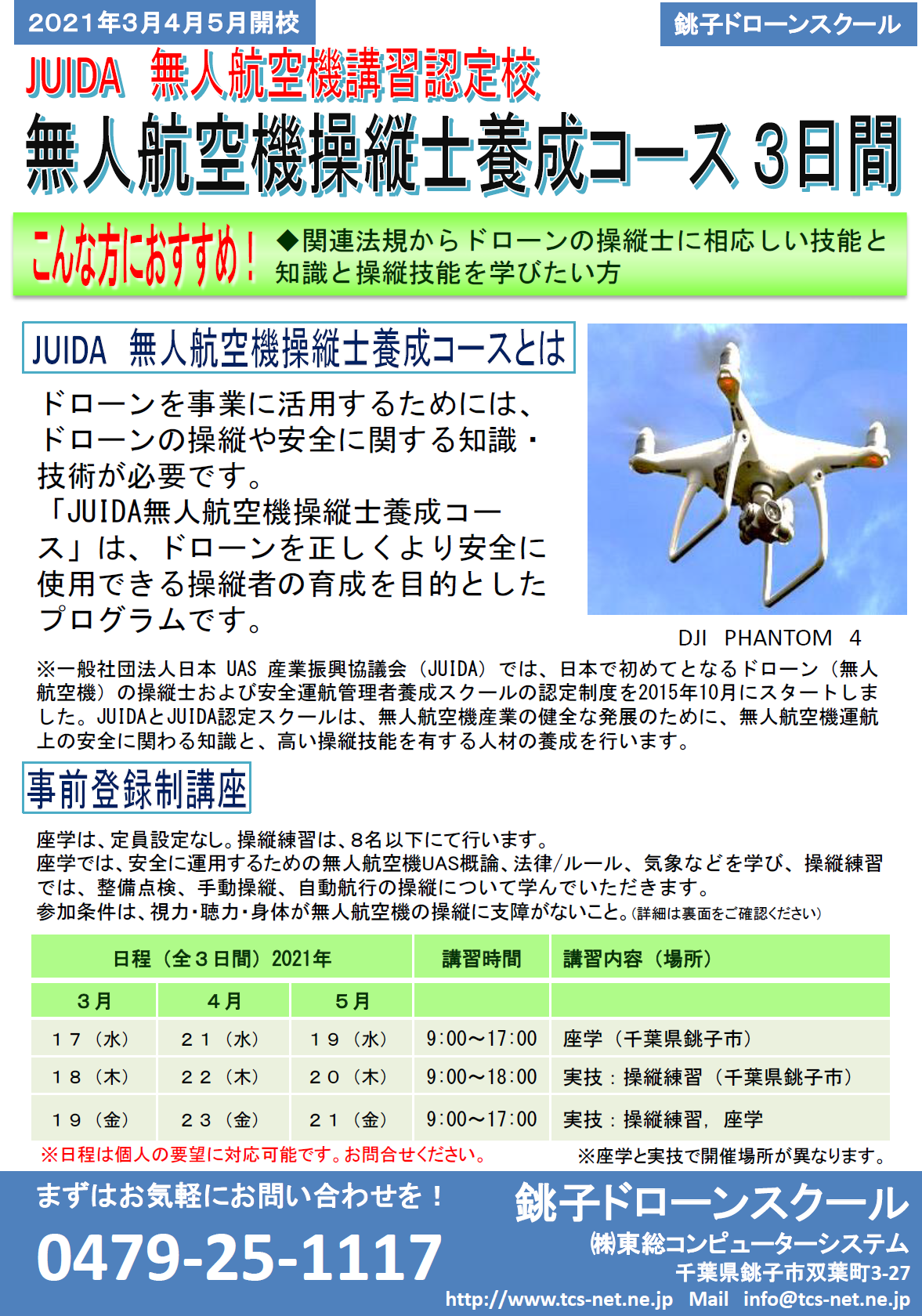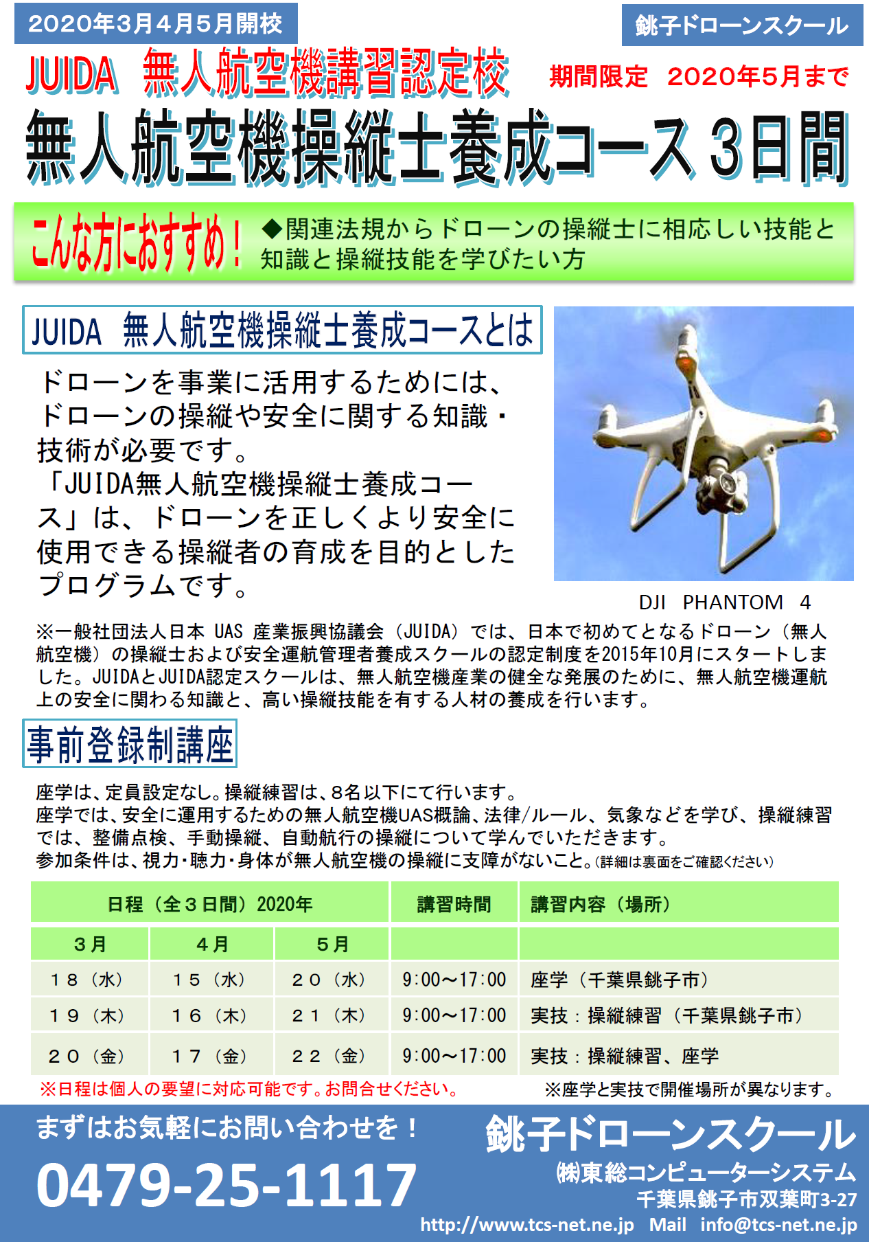 3月、4月、5月 無人航空機操縦士養成コース 受講者募集中3月日程 18(水)、19(木)、20(金) 4月日程 15(水)、16(木)、17(金) 5月日程 20(水)、21(木)、22(金)
