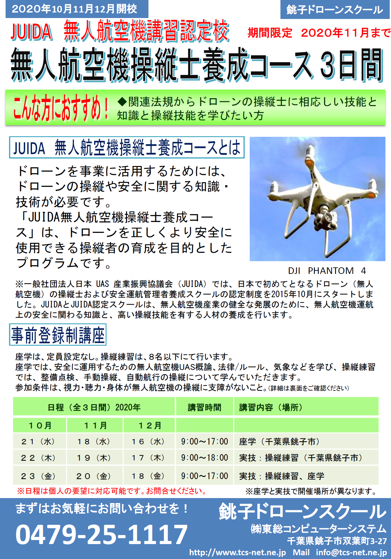 10月、11月、12月 無人航空機操縦士養成コース 受講者募集中10月日程 21(水)、22(木)、23(金) 11月日程 18(水)、19(木)、20(金) 12月日程 16(水)、17(木)、18(金)