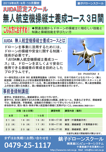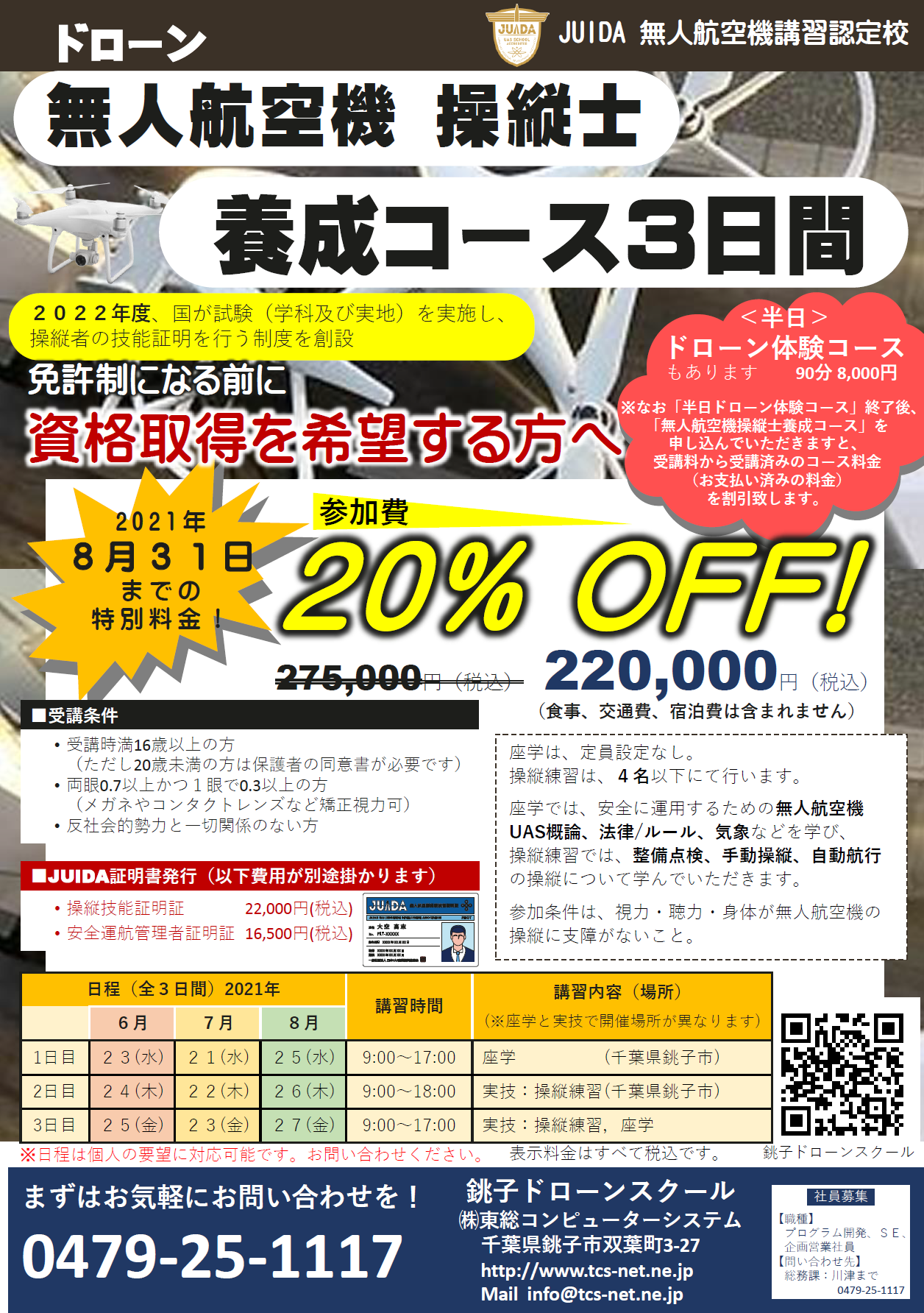 | 2019.4.15 | 5月 無人航空機操縦士養成コース 受講者募集中 お申し込みへ 日程 5月11日、5月18日、5月25日 4月1日~9月30日まで 新年度特価 実施中! 250,000円→200,000円 この機会にドローンの操縦士に相応しい技能と知識と操縦を身につけませんか。 |